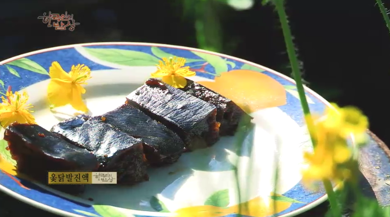‘옻닭발진액’은 닭발에 옻나무물을 넣고 담가 두었다가 닭발을 물에 넣고 우슬, 감초, 홍하씨, 옻나무 등 약초주머니를 만들어 넣고 하루를 끓입니다. 그리고 그릇에 넣고 식혀 잘라먹습니다.