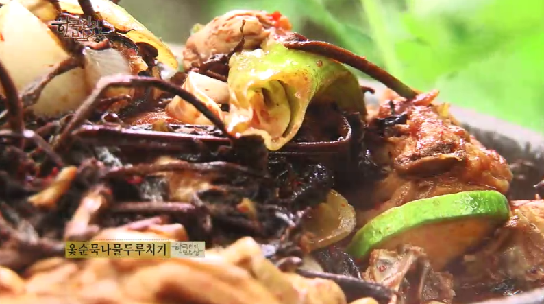 ‘옻순묵나물두루치기’는 말린 옻순을 물에 불린 뒤 물에 넣고 끓입니다. 그리고 팬에 들기름을 충분히 두르고 닭을 토막내서 볶습니다. 그리고 데친 옻순을 넣고 양념장을 넣고 파, 애호박 등 야채를 넣고 볶습니다.