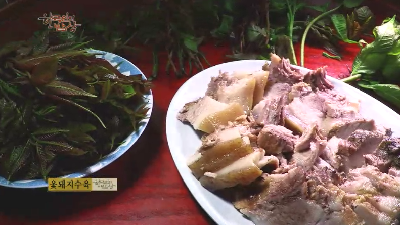 ‘옻돼지수육’은 돼지살코기에 옻나무를 넣고 푹 고아줍니다. 그리고 옻순에 고기 한 점 쌈장을 올려 먹습니다.