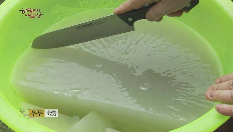 ‘우무’는 물에 우뭇가사리를 넣고 40분정도 푹 삶습니다. 그리고 면보에 넣고 꾹짜서 그릇에 넣고굳힙니다.
