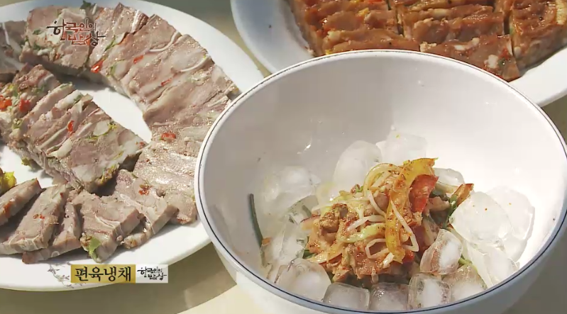 ‘편육냉채’는 매실청, 고춧가루, 식초 등 양념을 만들고 돼지편육, 다진청양고추, 콩나물, 피망, 오이, 양파,대추 등을 넣고 잘 비빕니다.
