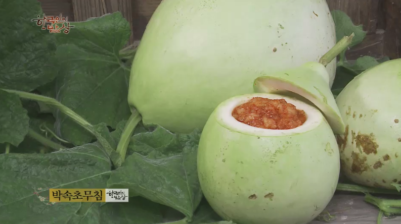 ‘박속초무침’은 박의 씨를 발라내고 업어서 무르게 찐 다음 숟가락으로 긁어서 그릇에 담고 초고추장양념을 만들어 넣고 비빕니다.