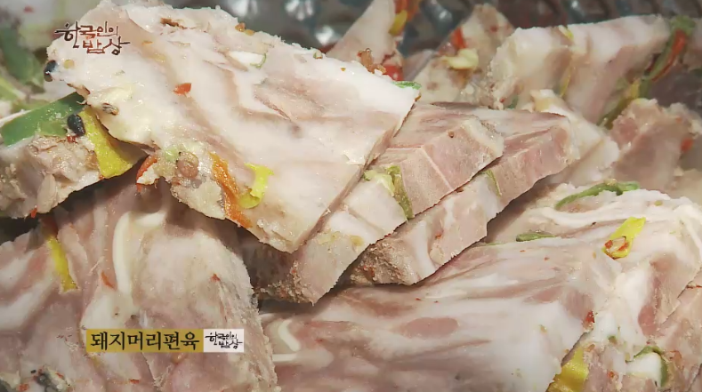 ‘돼지머리편육’은 돼지머리를 손질해서 끓는 물에 넣고 오래 삶아 흐물흐물해질 때까지 삶습니다. 그리고 살을 발라 다지고 매운고추, 피망 등을 넣고 잘 버무린 뒤에 보자기에 넣고 꾹 눌러서 3일 정도 응고를 시킵니다. 그리고 먹기 좋게 자릅니다.
