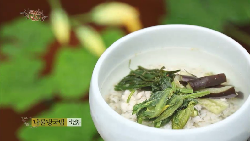 ‘나물냉국밥’은 호박 수꽃을 따서 씻은 뒤 밥을 짓고 뜸 들이기 전에 가지, 부추, 호박수꽃을 올리고 뜸을 드립니다. 잘 쪄진 수꽃을 먹기 좋게 찢어 깨소금, 다진마늘, 간장을 넣고 조물조물 무친 다음 가지와 부추도 따로 양념해서 보리밥 위에 나물을 올리고 찬물을 붓습니다.