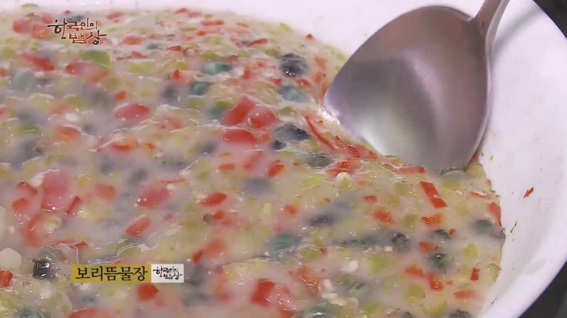 ‘보리뜸물장’은 보리를 씻어 쌀뜨물을 갈아앉혀서 전분을 만들고 고추를 다져서 넣고 다슬기 한 줌 넣고 찝니다.