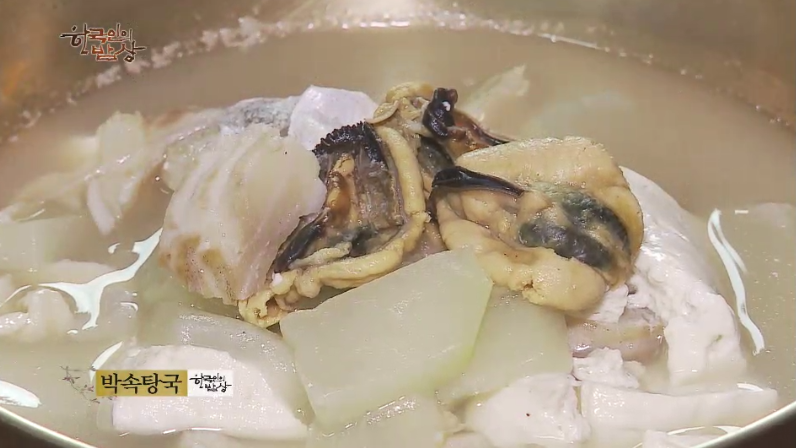 ‘박속탕국’은 박 속을 발라내고 나박하게 썰어 그릇에 깔고 바지락, 동태, 홍합 말린 것 등을 넣고 물을 넣은 뒤에 끓입니다.