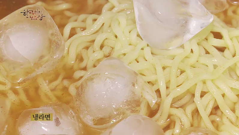 ‘냉라면’은 찬물에 라면을 넣고 끓입니다. 그리고 찬물에 헹군 다운 찬물을 넣은 뒤 스프를 풀고 얼음을 넣고 김치와 막걸리와 먹습니다.