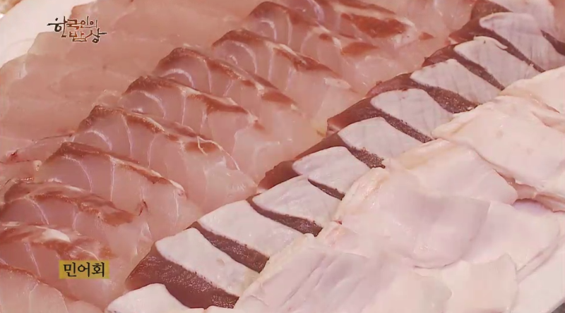 민어 숫놈은 두껍습니다. 그리고 배바지(뱃살) 자체에서 세 가지 맛이 납니다.