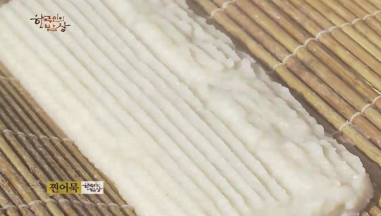 ‘찐어묵’은 어묵반죽에 콩비지를 넣고 잘 비벼줍니다. 그리고 김발에 반죽을 넣어 예쁘게 싸서 찜통에서 찝니다.