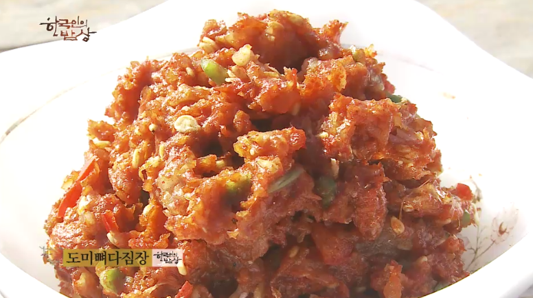 ‘도미뼈다짐장’은 어묵을 하고 남은 뼈를 잘게 다지고 다진 홍〮청고추, 다진마늘, 깨소금, 고춧가루 등을 넣고 잘 비벼서 먹습니다.