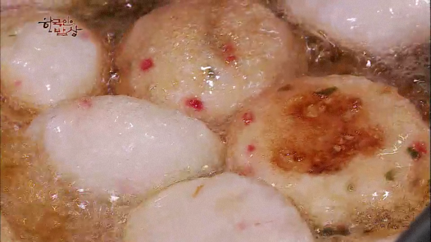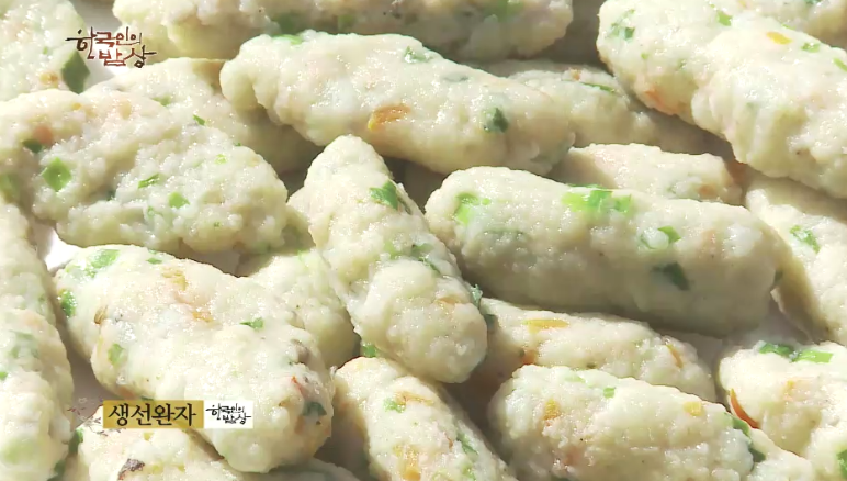 ‘생선완자’는 어반죽을 둥글게 만들어서 끓는 육수에 넣고 삶은 뒤에 건집니다.