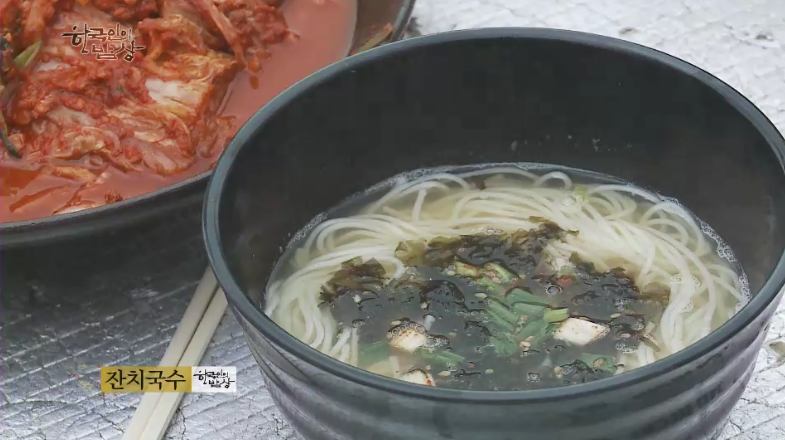 ‘잔치국수’는 끓는 물에 건멸치, 건전갱이를 넣고 끓이다가 파, 양파, 무도 넣어줍니다. 국수를 삶은 뒤에 바로 육수를 넣고 김가루와 양념장을 넣어줍니다. 김치에 싸서 먹습니다.