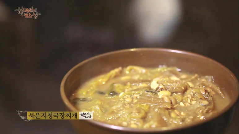 ‘묵은지청국장찌개’는 2년 된 묵은지를 물에 여러 차례 씻어 냅니다. 물에 된장, 청국장을 섞어서 끓인 뒤에 씻은 김치를 잘게 찢어서 넣고 파, 다진 마늘 등을 넣고 끓입니다.