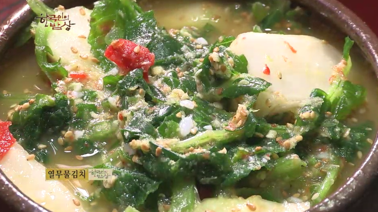 ‘열무물김치’는 확독에 고추와 된장을 갈아줍니다. 그리고 절인 열무를 넣고 잘 섞어줍니다. 그리고 옹기에 넣어 숙성을 시킨 뒤 군고구마와 같이 먹습니다.
