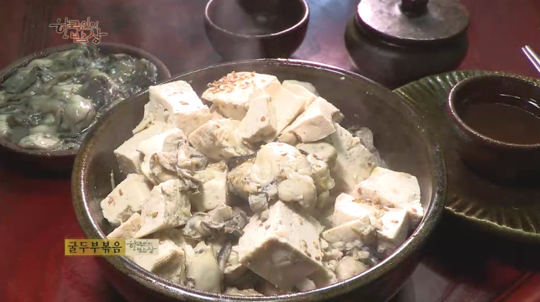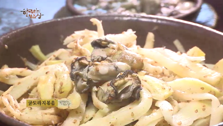 ‘굴도라지볶음’은 굴을 팬에 기름을 두르고 볶아 줍니다. 그리고 도라지, 다진파, 깨소금 등을 넣고 볶아줍니다.