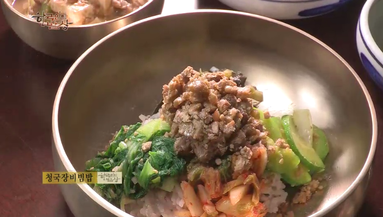 ‘생청국장비빔밥’은 시래기, 다진파, 된장을 넣고 무쳐 주고 밥 위에 올려주고 김치, 나물을 올린 뒤 생청국장을 넣고 비벼 먹습니다.