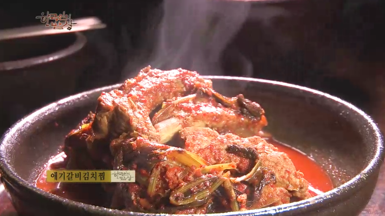 ‘애기갈비 김치찜’은 된장물에 등갈비를 넣고 끓입니다. 삶은 등갈비를 고추장, 매실액 등을 넣고 잘 버무린 뒤에 김치를 깔고 그 위에 올려서 푹 끓여줍니다.