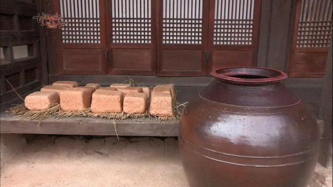 장을 담그기 전에 잡냄새와 잡균을 없애기 위해 항아리를 물로 깨끗이 씻은 뒤에 짚에 불을 붙인 뒤에 속을 훈연해주고 엎어 놓습니다. 메주콩을 삶아 절구에 넣고 찧어줍니다. 그리고 틀에 넣고 네모나게 만들어서 짚 위에 다 올려 놓습니다.