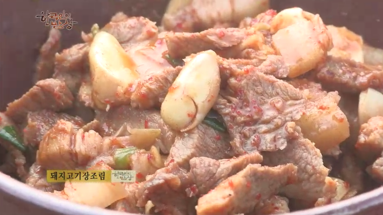 ‘돼지고기장조림’은 옹기 뚜껑에 흙을 넣고 장작을 피웁니다. 그리고 고기를 된장에 묻어 다니다가 솥에 물이 끓으면 넣고 삶습니다. 먹기 좋게 썰은 뒤에 간장 등 양념을 넣고 조려줍니다.