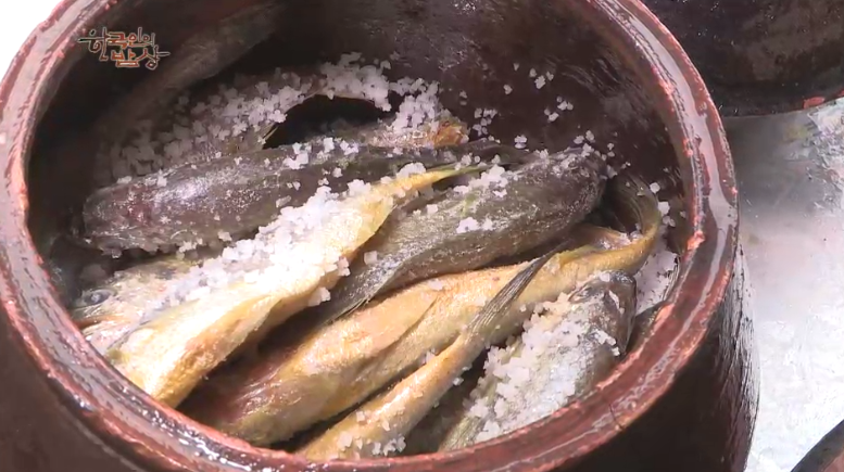 ‘깡다리구이’는 깡다리(강달어 : 민어과의 바닷물고기)를 소금을 뿌려 옹기에 넣어 저장해두었다가 석쇠에 굽습니다.