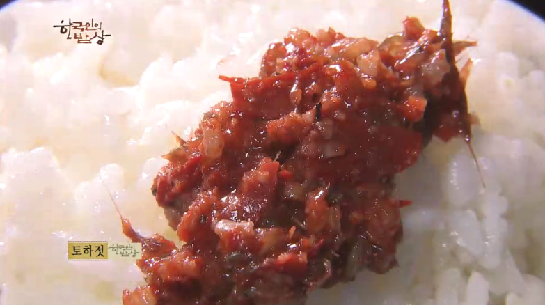 ‘토하젓’은 옹기에 토하와 소금을 넣고 3개월 숙성 시킨 후 먹을 때 밥, 마늘, 고추장 등 양념을 넣고 잘 비벼 줍니다.