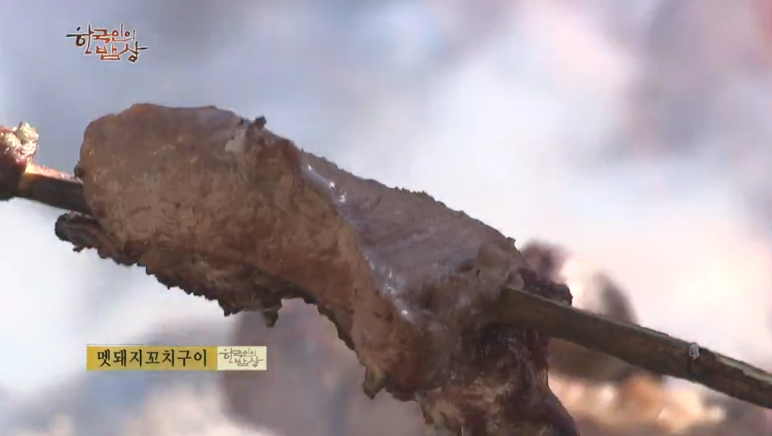 ‘멧돼지배받이살구이’는 장작을 피운 뒤에 멧돼지 배받이살을 석쇠에 올린 뒤에 소금을 뿌리고 계속 뒤집으면서 구워줍니다. 그리고 먹기 좋게 썰은 뒤에 다시 석쇠에 올려 완벽히 구워줍니다. (멧돼지는 겨울에 지방이 거의 없는데 배 쪽에 배받이살에는 지방을 축적해둬 맛있다고 합니다.)