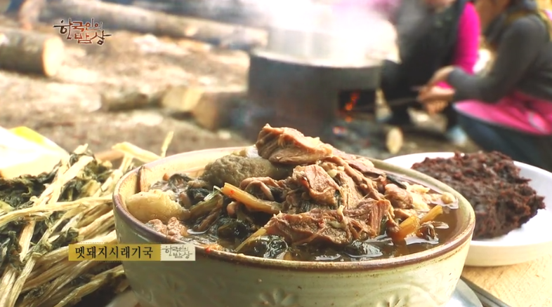 ‘멧돼지시래기국’은 멧돼지고기를 삶아서 잘게 찢어준 다음 솥에 막장을 풀고 시래기, 고기 등을 넣고 푹 끓입니다.