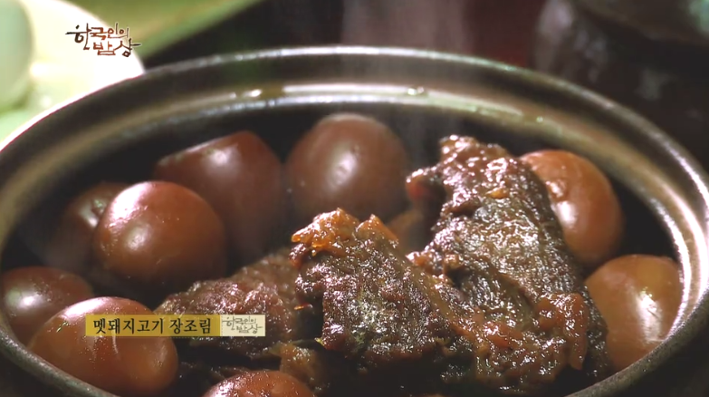‘멧돼지고기 장조림’은 뒷다리살을 토막내서 간장, 물엿, 삶은 메추리알, 마늘 등을 넣고 조립니다.