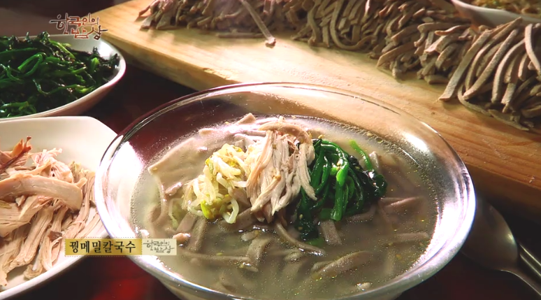 ‘꿩메밀칼국수’는 꿩을 압력솥에 넣고 푹 삶아서 살을 발라냅니다. 그리고 메밀반죽을 최대한 얇게 밀어 썹니다. 꿩삶은 육수에 면을 넣고 삶은 뒤에 꿩고기, 시금치, 숙주를 올려줍니다.