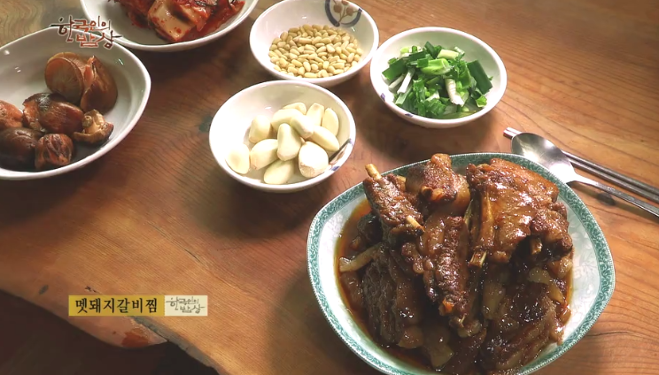 ‘멧돼지 갈비찜’은 갈비살에 잣, 말린표고버섯, 쪽파, 고춧가루에 간장양념을 넣고 잘 섞어서 압력솥에 넣고 푹 찝니다. (질긴 멧돼지고기를 푹 익히기 위해)