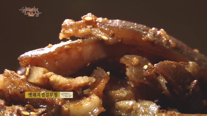 ‘멧돼지껍질무침’은 멧돼지 껍질을 숯불에 익힌 뒤에 탄 부분을 긁어주고 매달아서 꾸덕하게 말립니다. 그리고 솥에 물을 끓이고 넣은 뒤에 30~40분 정도 푹 삶아줍니다. 먹기 좋게 썰은 뒤에 마늘, 파, 된장 등을 넣고 잘 무쳐줍니다.