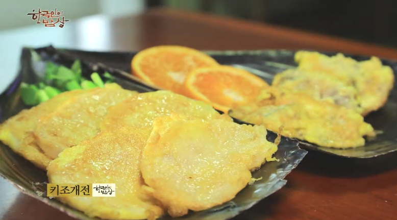 ‘키조개전’은 얇은 관자와 외투막에 밀가루옷, 달걀옷을 입혀서 팬에 기름을 두르고 약한불로 부쳐줍니다.