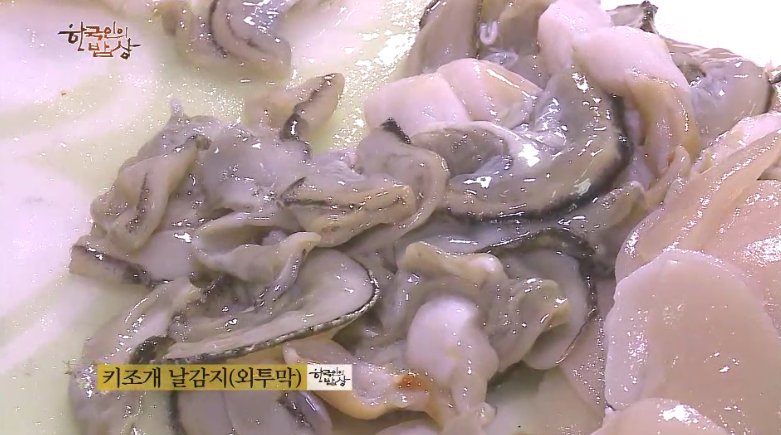‘키조개회무침’은 외투막을 소금을 넣고 박박 문질러서 깨끗이 씻고 먹기 좋게 썰은 뒤 오이, 미나리, 당근, 양파 등과 관자랑 함께 초장에 무쳐 줍니다.