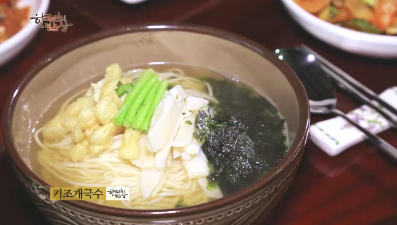 ‘키조개국수’는 냄비에 무, 통파, 꽃게, 다시마를 넣고 거름망에 고추씨, 땡초, 말린 밴댕이, 해삼 등을 넣고 물을 부은 뒤에 끓입니다. 그리고 소면을 삶은 뒤에 찬물에 씻은 뒤에 그릇에 넣고 유부, 미나리, 키조개, 김을 올리고 따뜻한 국물을 부어 줍니다.