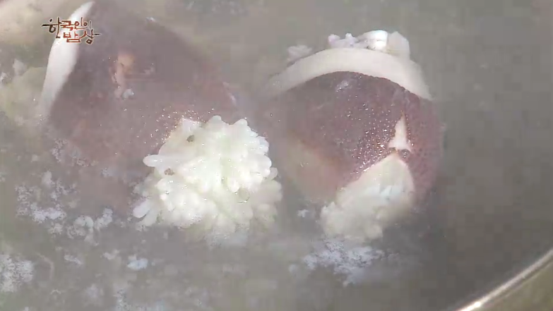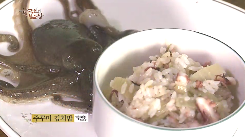 ‘주꾸미김치밥’은 주꾸미 내장을 제거하고 손질을 합니다. 먹기 좋게 썰고 김치를 씻어 송송 썰은 뒤 쌀 위에 올려서 밥을 짓습니다. 그리고 달래간장을 넣고 비벼 먹습니다.