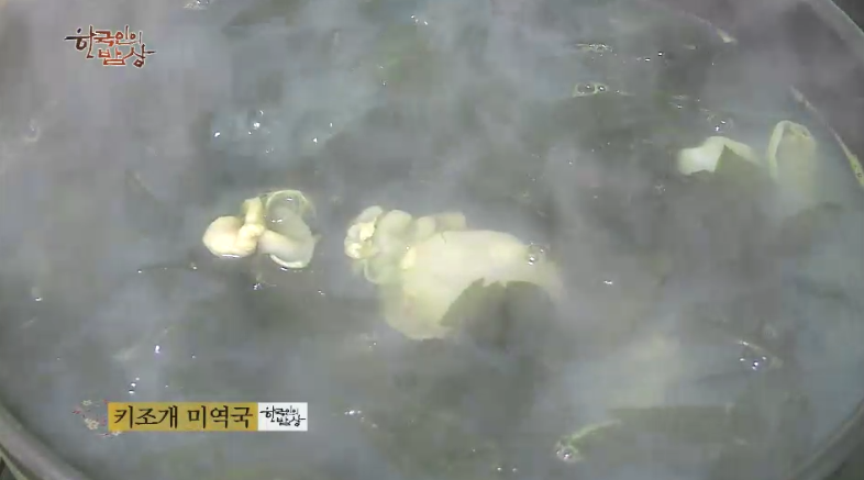 ‘키조개미역국’은 물에 불린 미역을 넣고 끓이다가 키조개를 얇게 썰어 넣은 뒤에 멸치액젓으로 간을 합니다.
