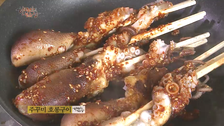 ‘주꾸미호롱구이’는 나무젓가락에 쭈꾸미 머리를 꽂고 돌돌 말아서 살짝 굽고 고춧가루, 간장, 깨 등으로 만든 양념을 바르면서 노릇하게 굽습니다.
