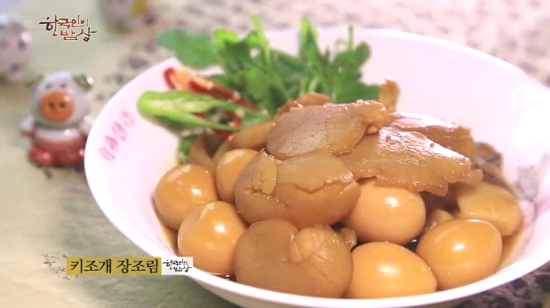 ‘키조개 장조림’은 얇게 썰은 관자를 끓는 물에 데친 뒤 냄비에 넣고 간장, 물엿, 메주리 알 등과 함께 조려줍니다.