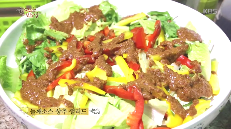 ‘들깨소스상추샐러드’는 상추, 파프리카 등 야채를 먹기 좋게 썰어 넣고 들깨까루1:발사믹식초,1, 올리브오일, 고춧가루를 넣고 비벼서 샐러드 위에 뿌립니다.