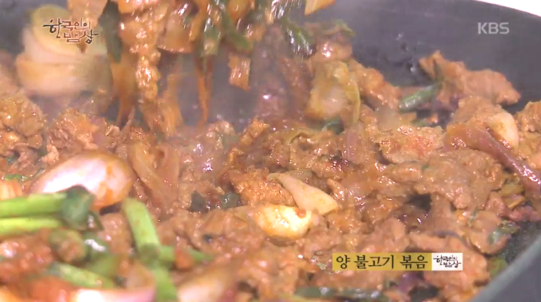 ‘양불고기볶음’은 양고기를 다듬어서 적양파, 쪽파 등에 다진마늘, 고추장, 고춧가루, 설탕 등으로 양념을 해서 무쳐줍니다. 그리고 숙성을 시켜 놓았다가 팬에서 볶아줍니다.