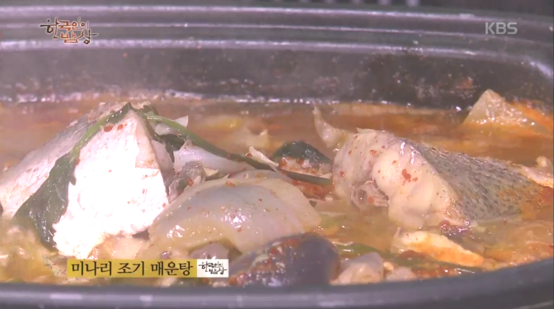 ‘미나리조기매운탕’은 무를 나박하게 썰어 물에 넣고 된장을 푼 다음에 생선을 손질해서 넣고 끓으면 고춧가루도 풀고 야채를 넣고 끓입니다.