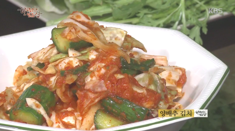 ‘양배추김치’는 양배추를 자르고 오이와 함께 소금을 뿌려 절인 다음 고춧가루로 김치 양념을 만들어서 비벼줍니다.