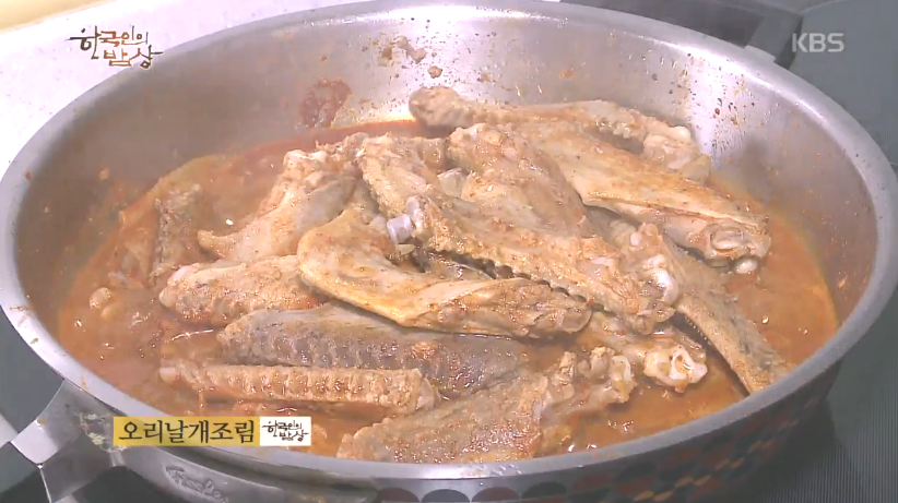 ‘오리날개조림’은 오리날개를 삶은 뒤 냄비에 넣고 고추장, 고춧가루, 다진마늘, 간장을 넣고 조려 줍니다.