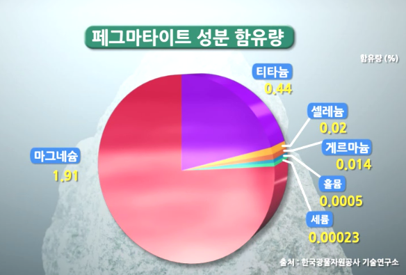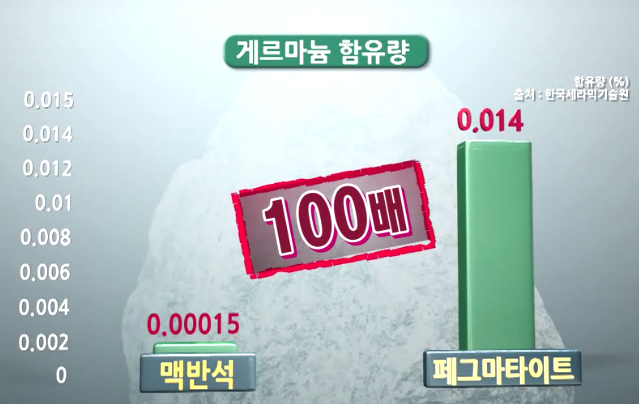 페그마타이트라는 명칭의 돌이 있습니다. 마그마에서 분리되어 나온 화강암으로 주성분이 게르마늄, 셀레늄, 헬륨 등이 들어있습니다. 동물이 섭취했을 때 너무 많이 먹으면 안 되지만 사료에서 약 2~3% 혼합해서 먹으면 혈류가 좋아지니까 지방이 덜 축적됩니다. 돼지 같은 경우는 지방이 없이 육질이 단단하고 냄새가 없고 맛이 좋다고 합니다. 페그마타이트는 물을 뿌리면 푸른빛이 돕니다. 다른 돌에 비해 특이 성분이 많고 맥반석보다 게르마늄 함유량이 100배 많습니다.