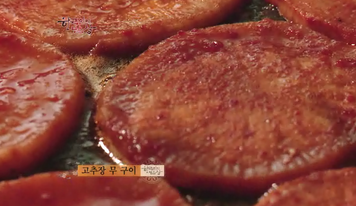 ‘고추장 무구이’는 버려지는 무를 고추장에 얹어서 기름에 구워 먹게 되는데 질감이 아주 쫄깃하고 버섯보다 더 맛있는 무구이가 됩니다. 밭에 버려진 무가 얼었다 녹았다하면서 질감이 달라진 것을 씁니다.