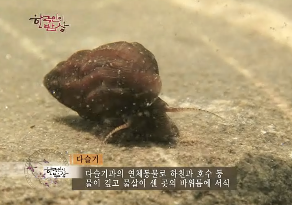 돌을 들추면 돌 밑에 다슬기가 붙어 있습니다. 6월에 다슬기가 산란을 앞두고 있어 제일 맛있을 때라고 합니다. 다슬기는 간기능을 향상시키고 빈혈증치료해준다고 하여 민간요법으로 많이 쓰였습니다. 아미노산 함량이 높아서 숙취해소에 좋습니다.
