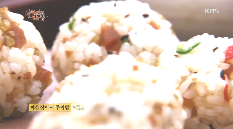 ‘매실장아찌 주먹밥’은 매실장아찌 말랭이, 매실장아찌, 마늘장아찌, 청홍고추, 깨 등을 잘게 썰어 밥에 비벼 매실식초 조금 넣고 뭉쳐줍니다.