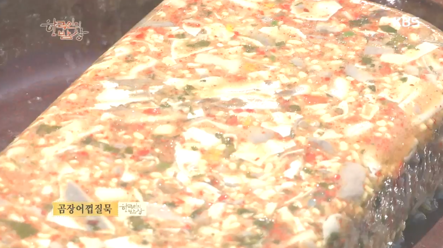 ‘곰장어껍질묵’은 곰장어껍질을 물에 넣고 된장을 채에 풀어 넣아준 뒤에 질긴 껍질이 부드러워 질 때까지 푹 삶아줍니다. 삶아지면 다진마늘, 파프리카, 청양고추를 잘게 다져서 넣고 끓입니다. 그리고 틀에 넣고 굳힌 뒤에 먹기 좋게 썰어줍니다.