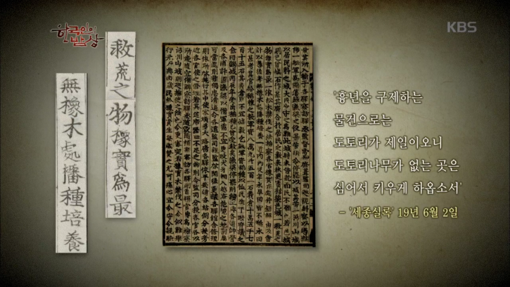 도토리는 조선시대에 중요한 구황작물로 기록되어 있습니다. 굶주림을 면하기 위해 정책적으로 도토리나무를 심기도 했습니다.