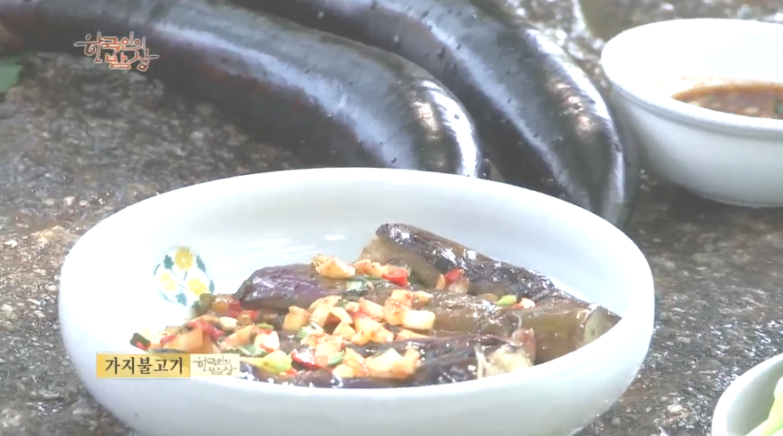 ‘가지불고기’는 가지에 십자로 칼집을 내고 팬에 기름을 두르고 구워 줍니다. 그리고 간장, 고춧가루, 다진고추, 다진양파, 깨소금 등을 넣고 소스를 만듭니다. 그릇에 가지를 담고 그 위에 소스를 올려줍니다.